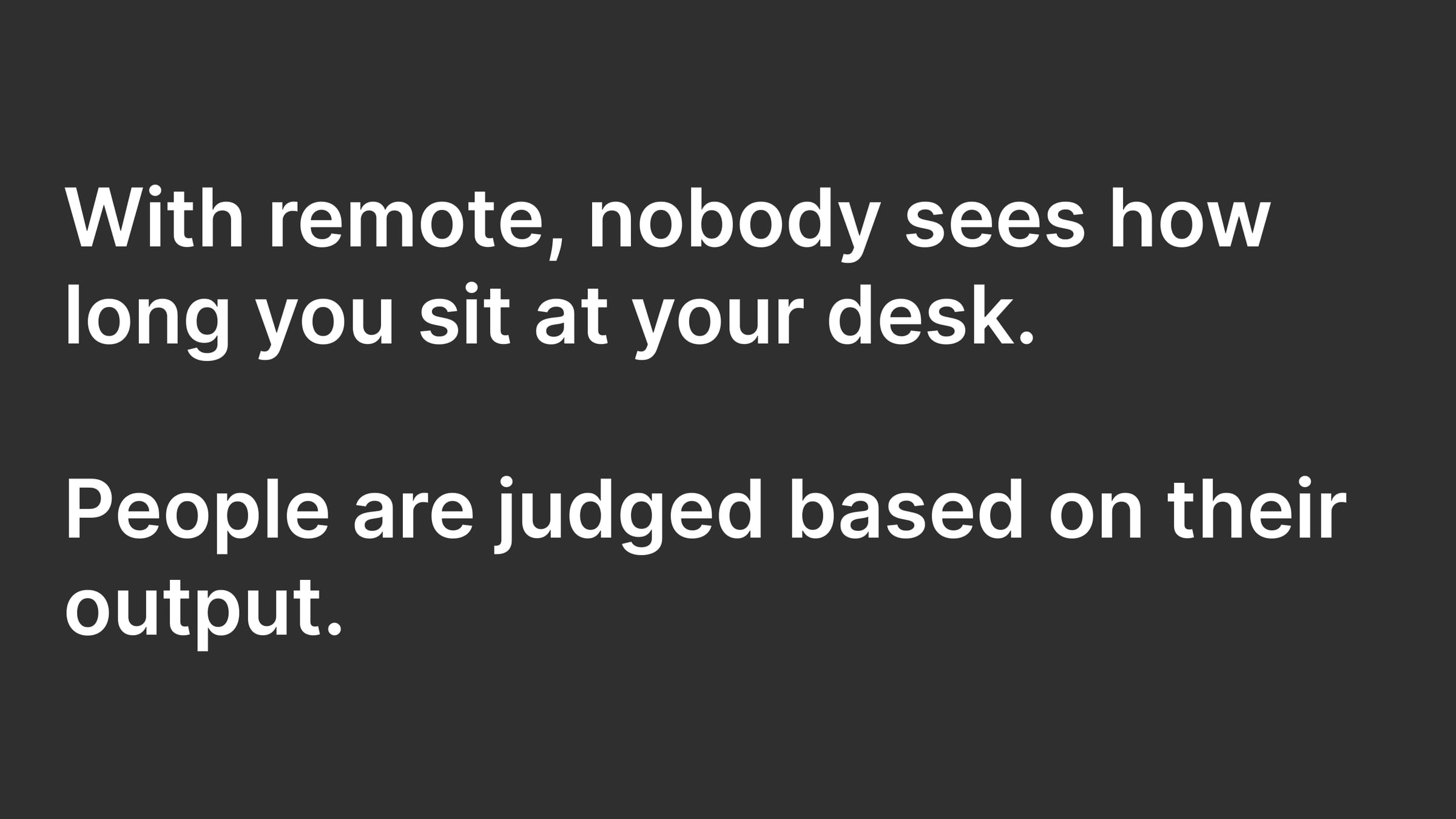 With remote, nobody sees how long you sit at your desk. People are judged based on their output.