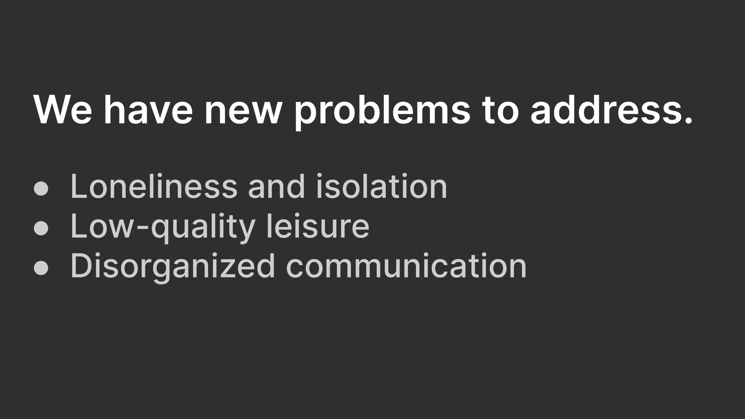 We have new problems to address: Loneliness and isolation; Low-quality leisure; Disorganized communication