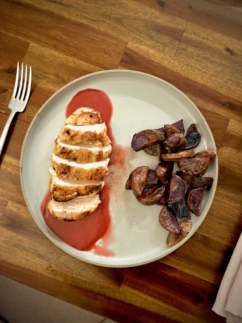 End - fermented cherry gastrique with roasted chicken and purple potatoes
