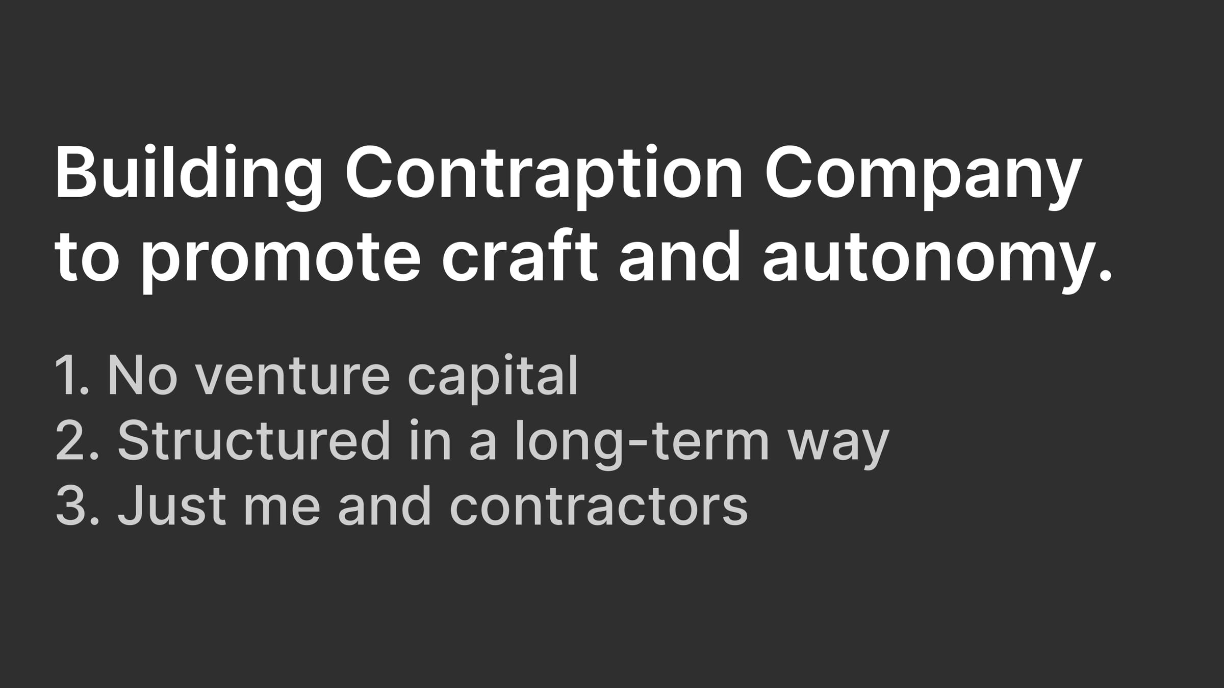 I'm building Contraption Company in a different way than my past startups. I structure the company in pursuit of craft and autonomy. I avoid time constraints when developing products. The company structure supports operating multiple long-term products. And, it is a one-person business - me - with occasional help from contractors.