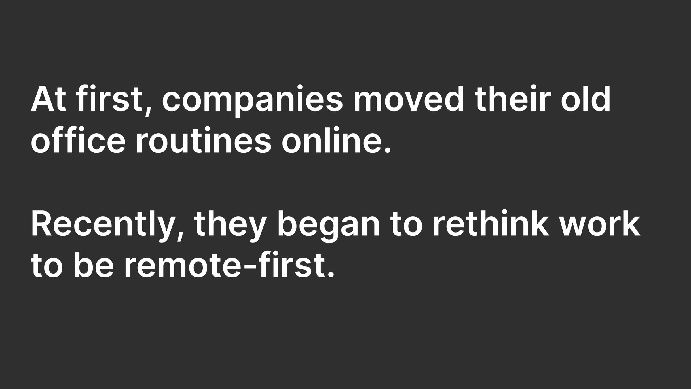 At first, companies moved their old office routines online. Recently, they began to rethink work to be remote-first.