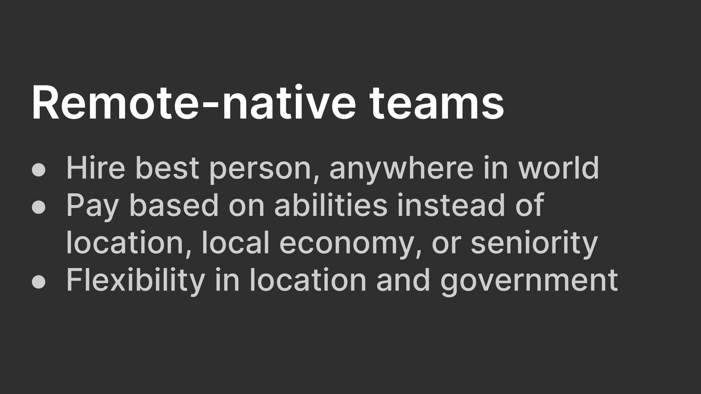 Remote-native teams: Hire best person, anywhere in world; Pay based on abilities instead of location, local economy, or seniority; Flexibility in location and government