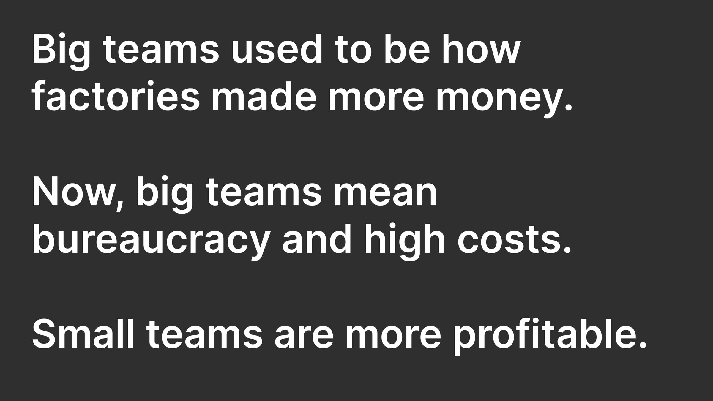 Big teams used to be how factories made more money. Now, big teams mean beaurocracy and high costs. Small teams are more profitable.