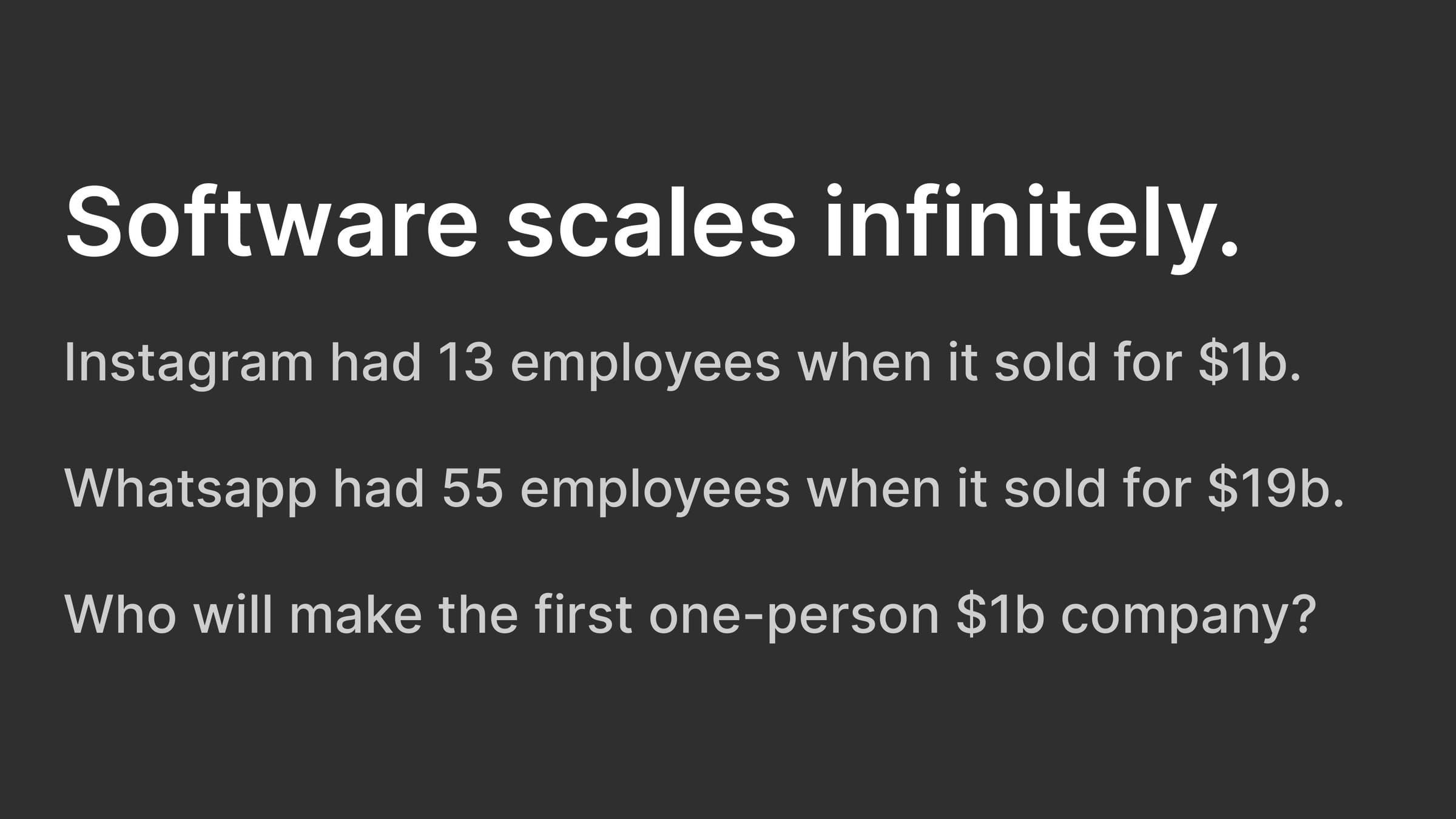 Software scales infinitely. Instagram had 13 employees when it sold for $1b. Whatsapp had 55 employees when it sold for $19b. Who will make the first one-person $1b company?