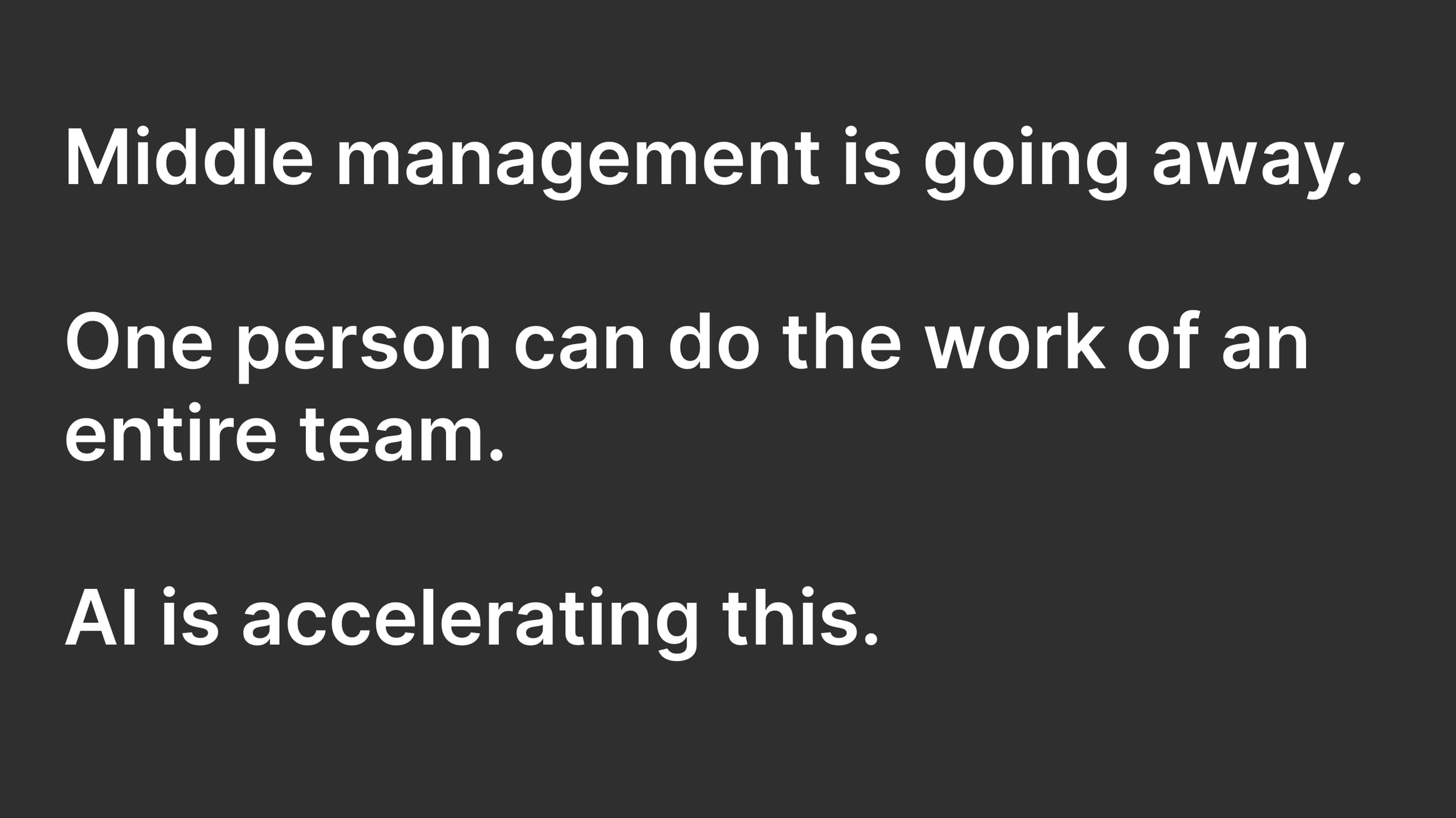 Middle management is going away. One person can do the work of an entire team. AI is accelerating this.