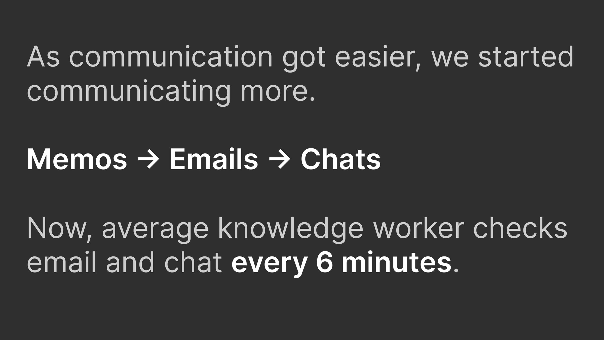 As communication got easier, we started communicating more. Memos, then emails, then chats. Now, average knowledge workers check email and chat every 6 minutes.