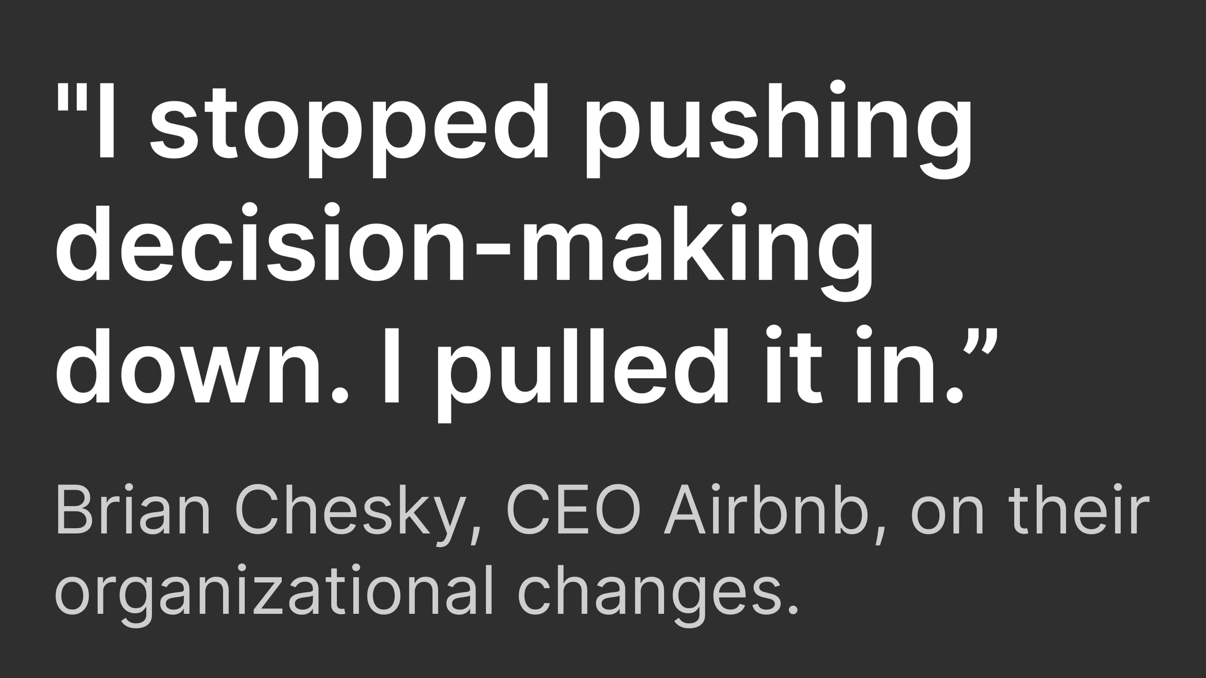 'I stopped pushing decision-making down. I pulled it in.' - Brian Chesky, CEO of Airbnb, on their organizational changes.