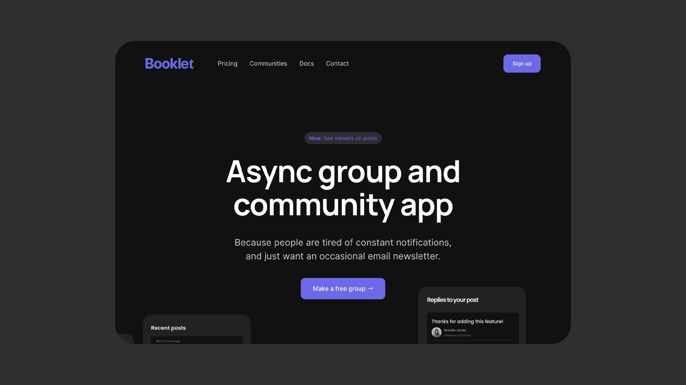 Booklet is the software I'm building to make communication more calm. It is an asynchronous community app that is an alternative to chat. It looks like a modernized email group software. I launched it three months ago and continue to work on it daily.